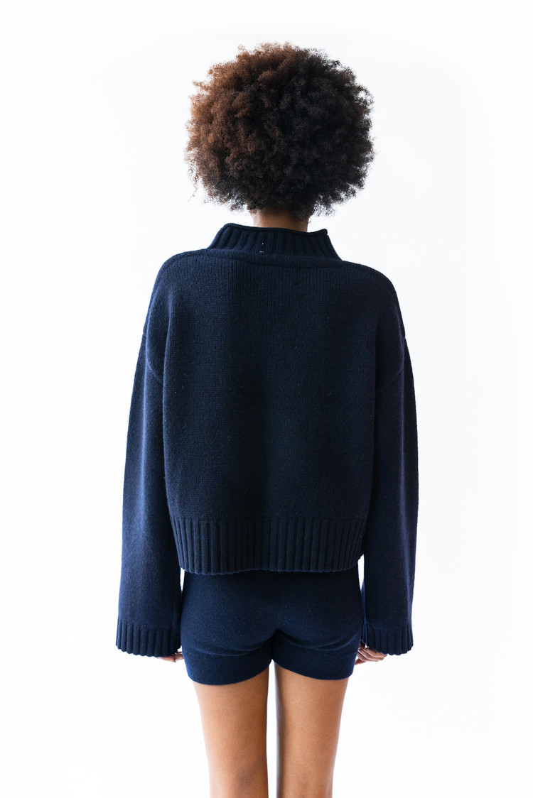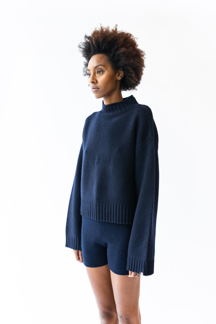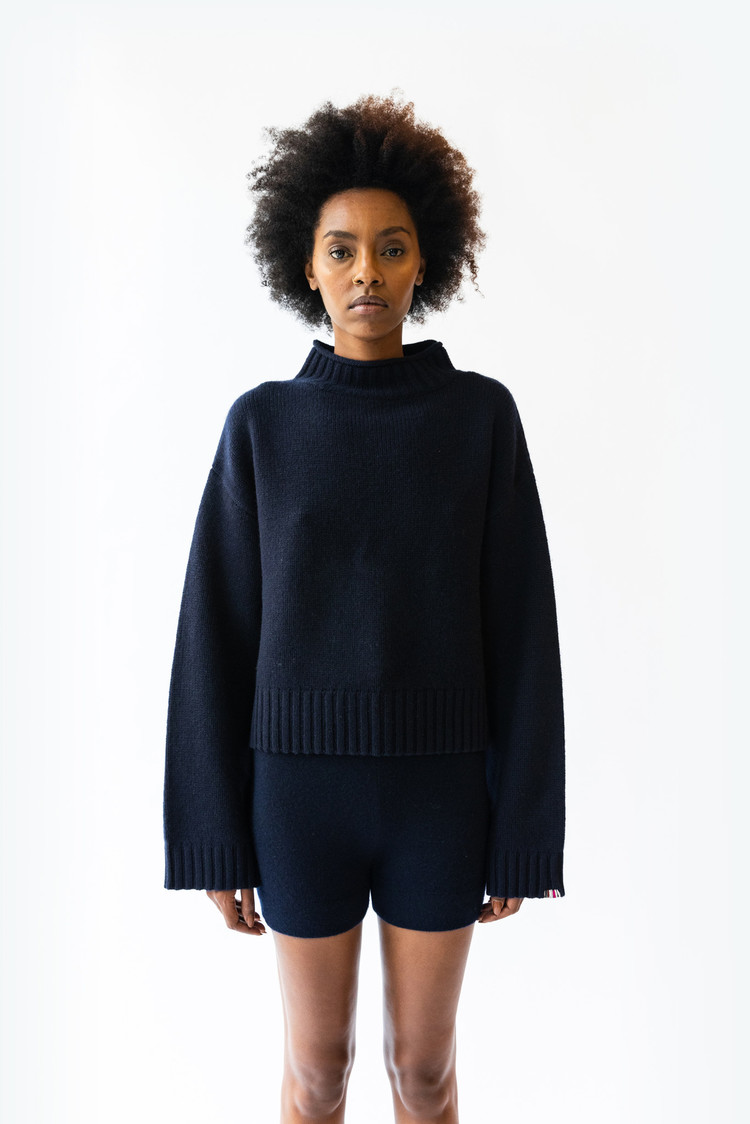 Extreme Cashmere’s focus on craftsmanship and elevated fabrication is captured through this navy Ken sweater, which is knitted from soft stretch cashmere. It’s falls from a rolled-edge high neck into dropped-shoulder sleeves and ribbed edges that bring a