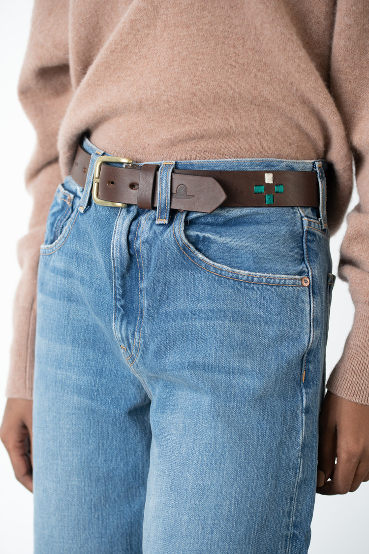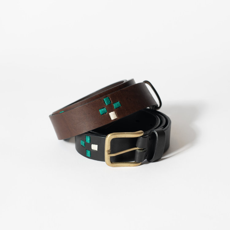 • A casual leather belt with signature cross embroidery in white and green. Available in Brown and Black. Made in USA.